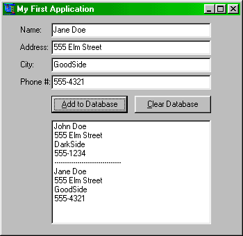 DIM MainForm AS QFORM DIM NameEdit AS QEDIT, AddrEdit AS QEDIT, _ CityEdit AS QEDIT, PhEdit AS QEDIT DIM NameLabel AS QLABEL, AddrLabel AS QLABEL, _ CityLabel AS QLABEL, PhLabel AS QLABEL DIM ListBox AS QLISTBOX DIM AddButton AS QBUTTON, ClearButton AS QBUTTON SUB AddButtonClick IF ListBox.ItemCount > 0 THEN '-- Add a nice separator ListBox.AddItems "--------------------------------" END IF ListBox.AddItems NameEdit.Text, AddrEdit.Text, _ CityEdit.Text, PhEdit.Text END SUB SUB ClearButtonClick ListBox.Clear END SUB NameLabel.Parent = MainForm NameLabel.Caption = "Name:" NameLabel.Top = 13 NameLabel.Left = 25 AddrLabel.Parent = MainForm AddrLabel.Caption = "Address:" AddrLabel.Top = 38 AddrLabel.Left = 25 CityLabel.Parent = MainForm CityLabel.Caption = "City:" CityLabel.Top = 63 CityLabel.Left = 25 PhLabel.Parent = MainForm PhLabel.Caption = "Phone #:" PhLabel.Top = 88 PhLabel.Left = 25 NameEdit.Parent = MainForm NameEdit.Left = 70 NameEdit.Top = 10 NameEdit.Width = 230 AddrEdit.Parent = MainForm AddrEdit.Left = NameEdit.Left AddrEdit.Width = NameEdit.Width AddrEdit.Top = 35 CityEdit.Parent = MainForm CityEdit.Left = NameEdit.Left CityEdit.Width = NameEdit.Width CityEdit.Top = 60 PhEdit.Parent = MainForm PhEdit.Left = NameEdit.Left PhEdit.Width = NameEdit.Width PhEdit.Top = 85 AddButton.Parent = MainForm AddButton.Left = 70 AddButton.Top = 115 AddButton.Width = 110 AddButton.Caption = "&Add to Database" AddButton.OnClick = AddButtonClick ClearButton.Parent = MainForm ClearButton.Left = 190 ClearButton.Top = 115 ClearButton.Width = 110 ClearButton.Caption = "&Clear Database" ClearButton.OnClick = ClearButtonClick ListBox.Parent = MainForm ListBox.Top = 150 ListBox.Left = 70 ListBox.Width = 230 ListBox.Height = 150 MainForm.Center MainForm.Caption = "My First Application" MainForm.Height = 340 MainForm.Width = 350 MainForm.ShowModal